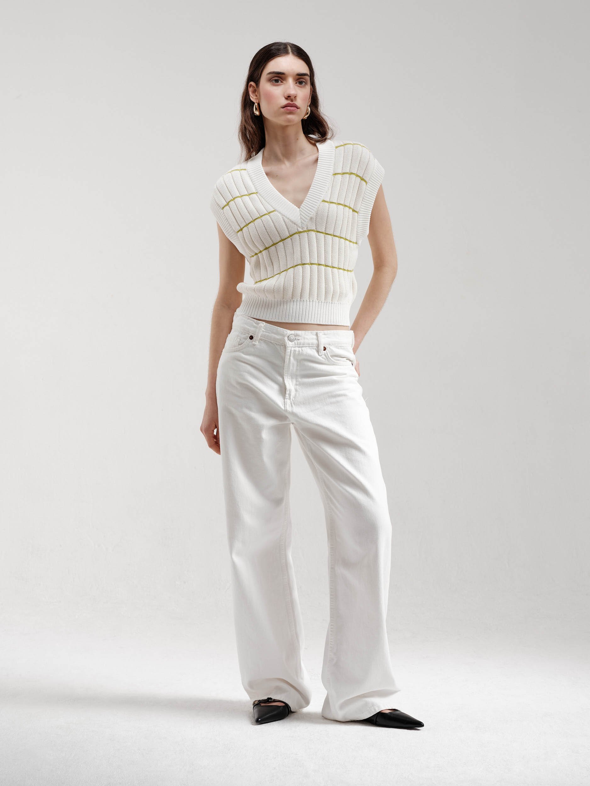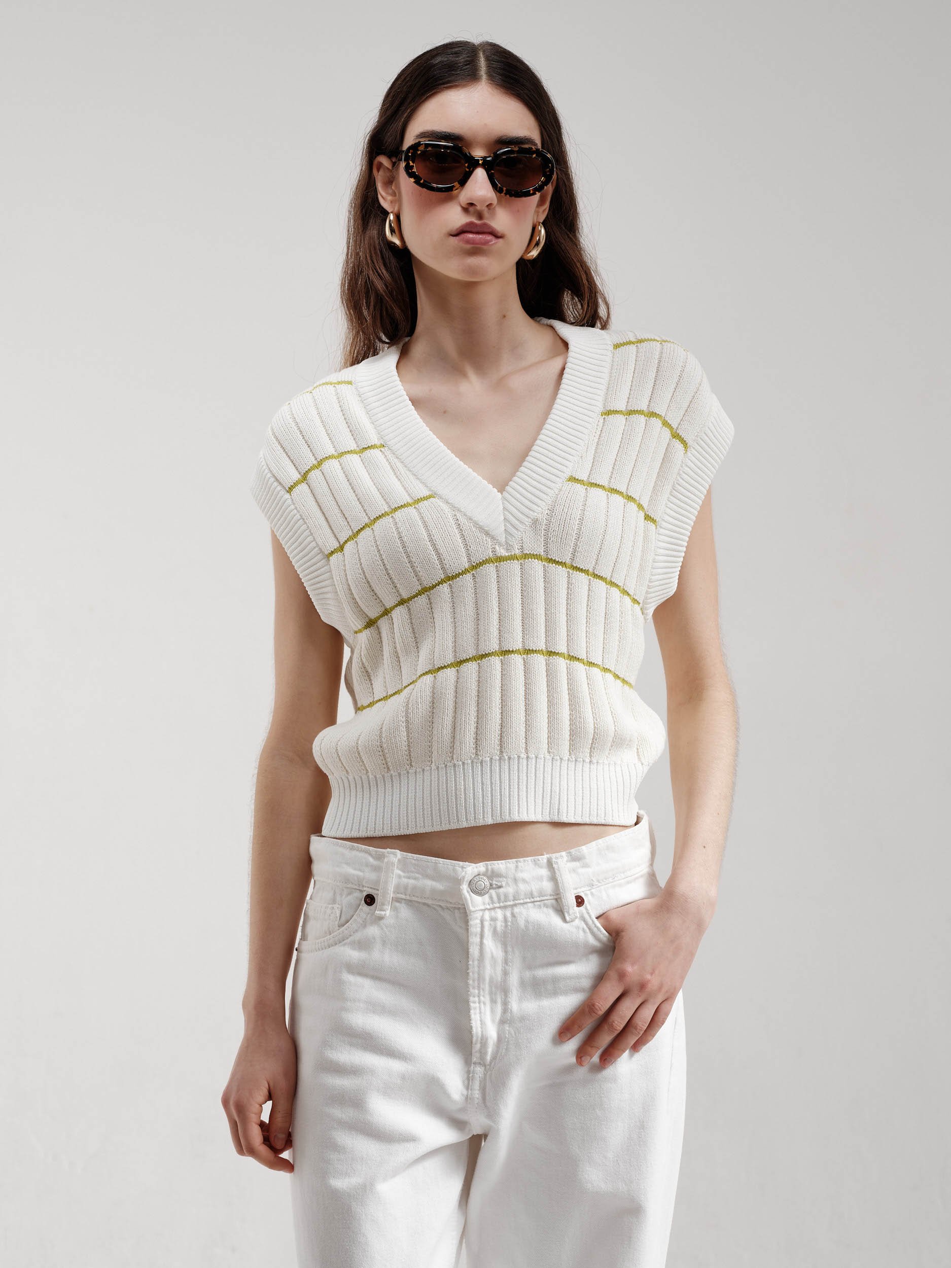 Off-white V-Neck sleeveless sweater with green stripes.